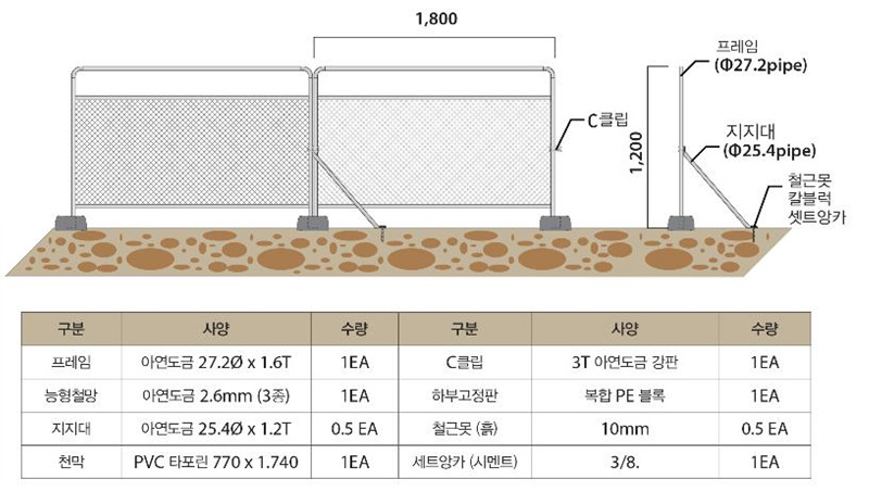 ▶ 규 격 : 휀스 : L1800 x H1200mm(받침대포함 지면에서 상단까지)