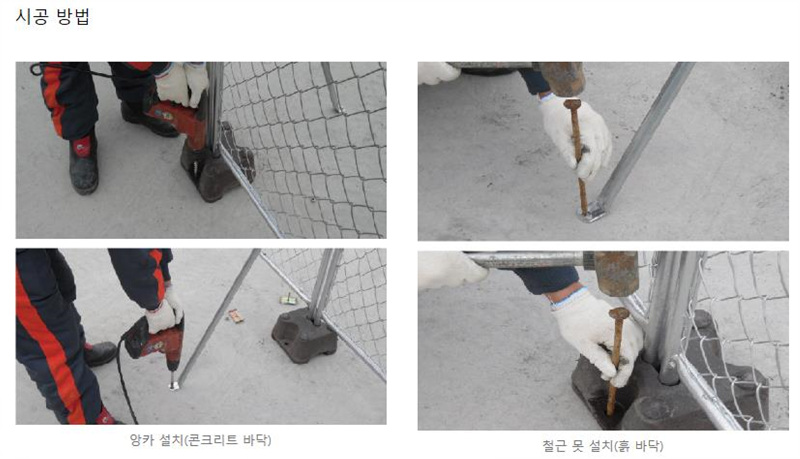 ** 휀스를 설치 하려는 바탕면이 흙이면 '철근못'으로, 콘크리트면이면 '세트앙카'로 출고