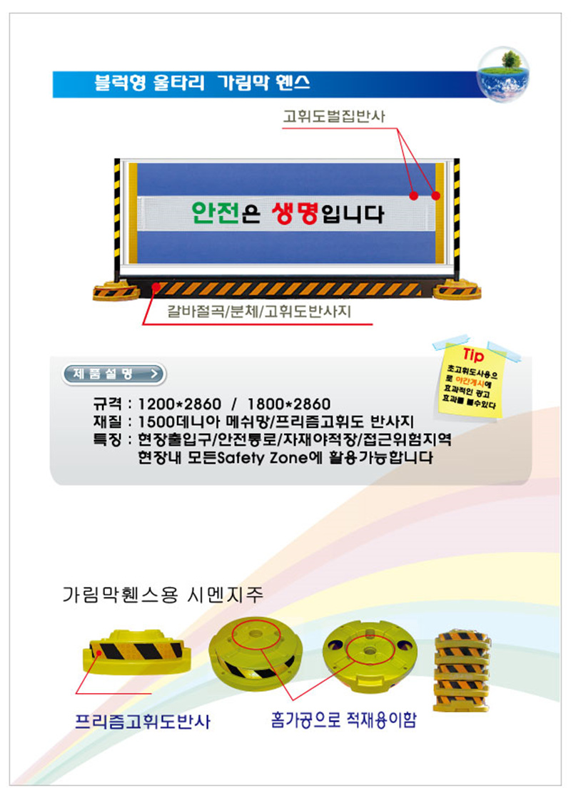 ▶ 구성 및 재질 : 수직파이프(POST)에 반사테이프+ PVC메쉬망