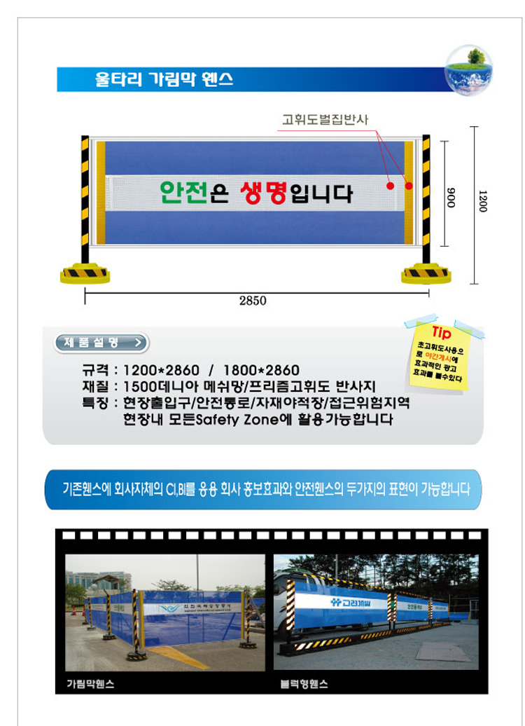 휀스바탕: PVC메쉬망, 반사지위에 인쇄, 원형 받침대(약25KG) : PVC함에 시멘몰탈충진